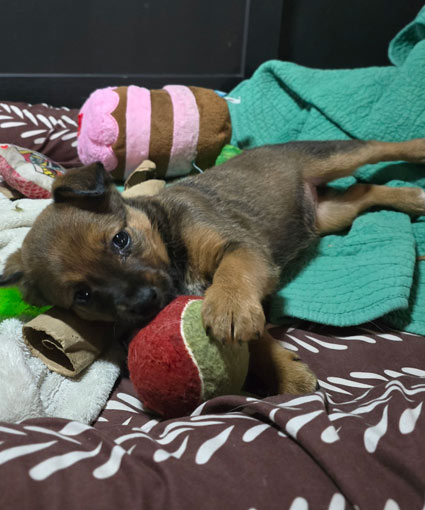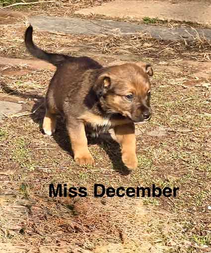 December is an energetic and bouncy puppy who is eager for play! She loves running and feeling the breeze in her ears. She has discovered puppy toys and found those are good for chewing. December was the first to begin using the puppy pads and is leading the way in potty training!