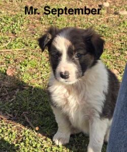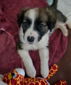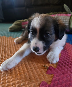 September is a handsome tri-color male. He is a bouncy little puppy who has enjoyed running “zoomies” around the house! His current preferred sleeping position is belly-up while his favorite feeding position is face-down and body blocking the food dish if allowed. He enjoys lots of playtime with toys, even toys that are five times his size. He is fast on his feet & will be even faster once his little brain fully connects to his feet! He is always on standby to do some running and also loves the company of other dogs!